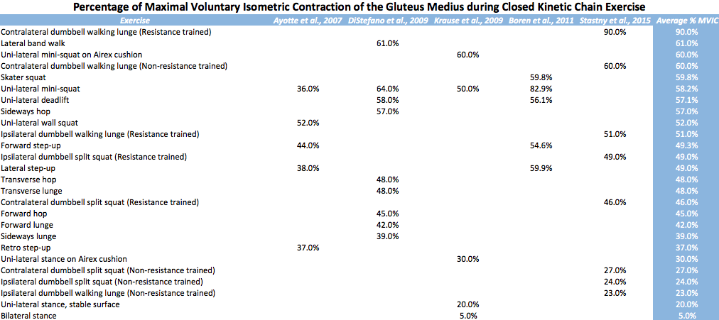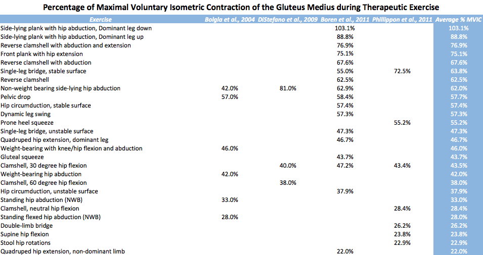 According to Reiman et al.11 and Escamilla et al.12, moderate electromyographic activity (EMG) activation (21-40% MVIC) is best used to facilitate endurance and neuromuscular re-education; high activation (41-60+% MVIC) in order to promote strength gains.